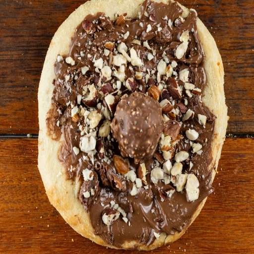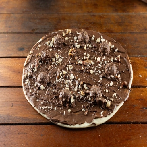 Uma base cremosa de chocolate ao leite com noz de avelã torradas e os magníficos bombom Ferrero Rocher.