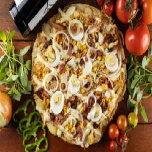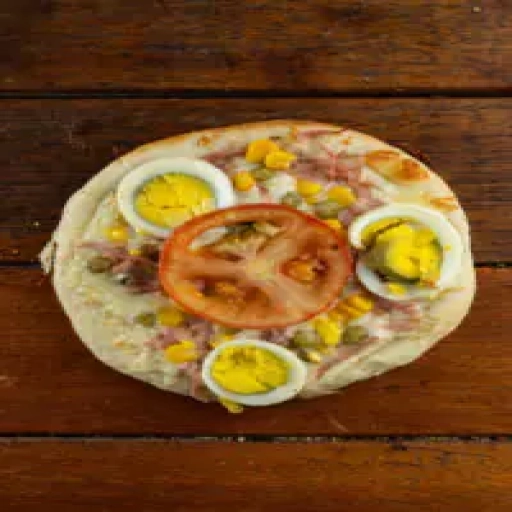 Muçarela, presunto, milho, ervilha, calabresa e tomate.